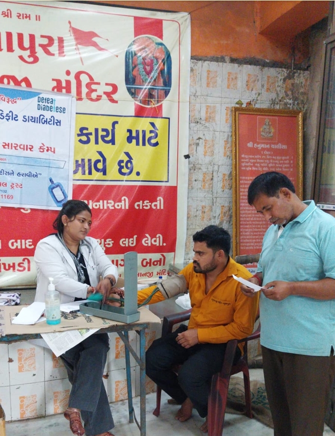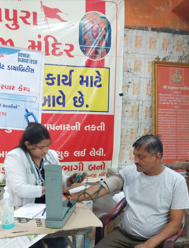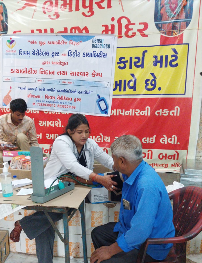 Under the campaign “એક યુદ્ધ ડાયાબિટીસ વિરુદ્ધ!”, led by Shivam Charitable Trust and Defeat Diabetes, a free Diabetes and Eye Check-up Camp was successfully organized at Bhumapura Hanumanji Temple, Mahemdavad, Kheda District, Gujarat on 30/08/2025, from 9:00 AM to 4:00 PM.