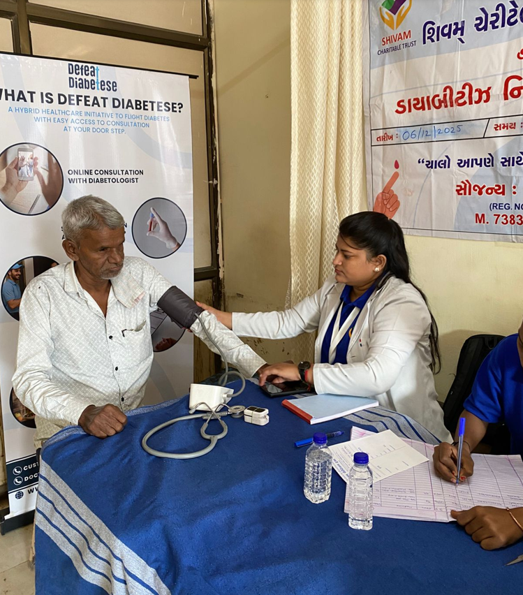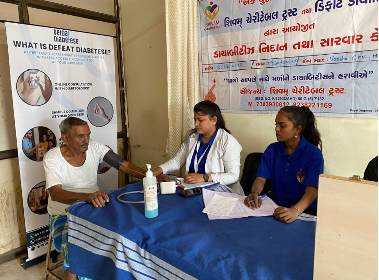 Under the “Ek Yudh Diabetes Virudh” campaign conducted by Shivam Charitable Trust through its Defeat Diabetes Project , a free Diabetes and Eye Check-up Camp was organized on 06/12/2025 at Pragati Nagar, opposite Jays Company, Motipura, Narol, Ahmedabad – 382405 . During the camp, more than 100 individuals underwent diabetes and eye screening. The screening results revealed that approximately 20% of participants showed signs of diabetes , while 10% were found to have eye-related issues . Such community-focused health camps aim to ensure timely diagnosis, spread health awareness, and promote preventive care, which remains the core objective of this campaign.